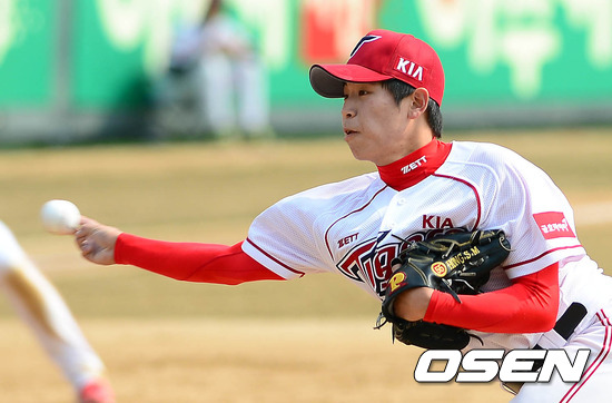 12일 오후 광주구장에서 열린 '2013 한국야쿠르트 세븐 프로야구' KIA 타이거즈와 SK 와이번스의 시범경기 5회초 교체된 박준표가 역투하고 있다.