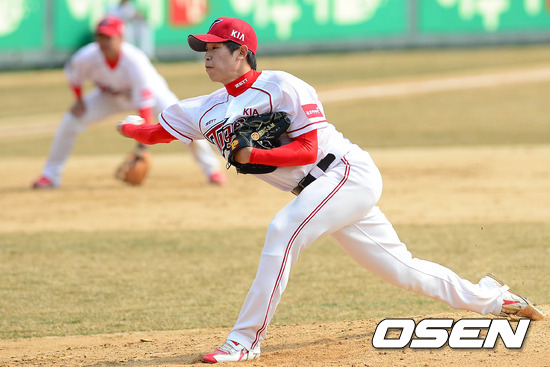 12일 오후 광주구장에서 열린 '2013 한국야쿠르트 세븐 프로야구' KIA 타이거즈와 SK 와이번스의 시범경기 5회초 교체된 박준표가 역투하고 있다.