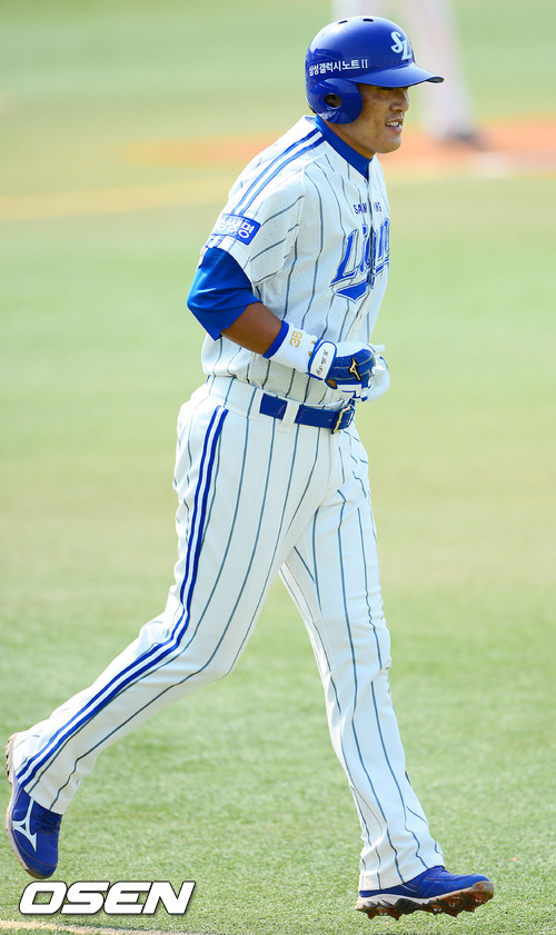 3회말 1사 주자 2,3루 삼성 이승엽이 타석에서 볼넷을 얻어 1루로 걸어나가고 있다.