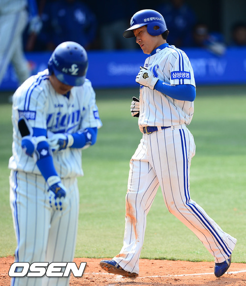 3회말 1사 주자 만루 삼성 최형우가 타석에서 볼넷을 얻어 밀어내기로 3루 주자 배영섭이 홈을 밟고 있다.