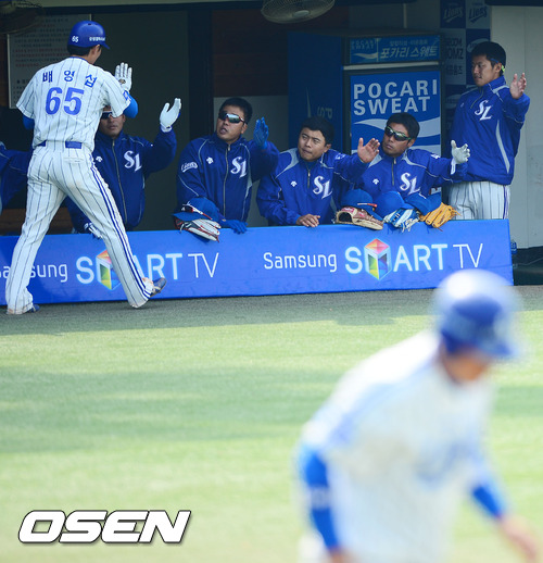 3회말 1사 주자 만루 삼성 최형우가 타석에서 볼넷을 얻어 밀어내기로 3루 주자 배영섭이 홈을 밟은 후 덕아웃에서 동료들과 기쁨을 나누고 있다.