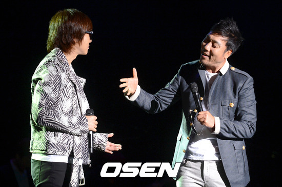 12일 오후 서울 서강대 메리홀에서 진행된 ' 2013 대.한.민.국 이문세' 제작발표회에서 윤도현과 이문세가 오프닝 무대를 선보이고 있다.