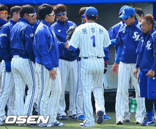 4회초를 마무리한 삼성 선발 윤성환이 덕아웃에서 동료들과 하이파이브를 하고 있다.