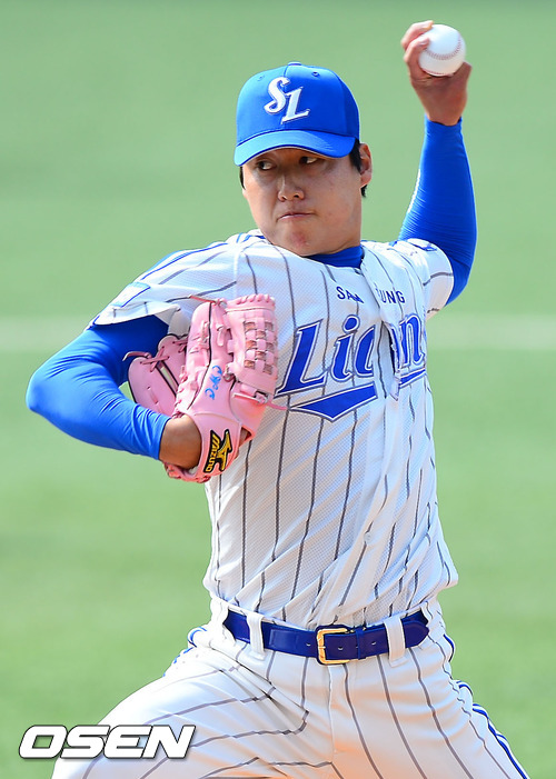 5회초 삼성 선발 윤성환 대신 마운드에 오른 삼성 차우찬이 힘차게 공을 뿌리고 있다.