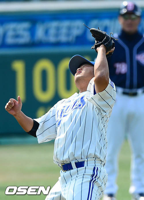 5회초 선두타자 두산 손시헌의 타구를 삼성 3루수 박석민이 잡아내고 있다.