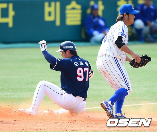 4회초 2사에 두산 오재원이 우중간 안타를 치고 3루에 몸을 던지며 세이프 되고 있다.