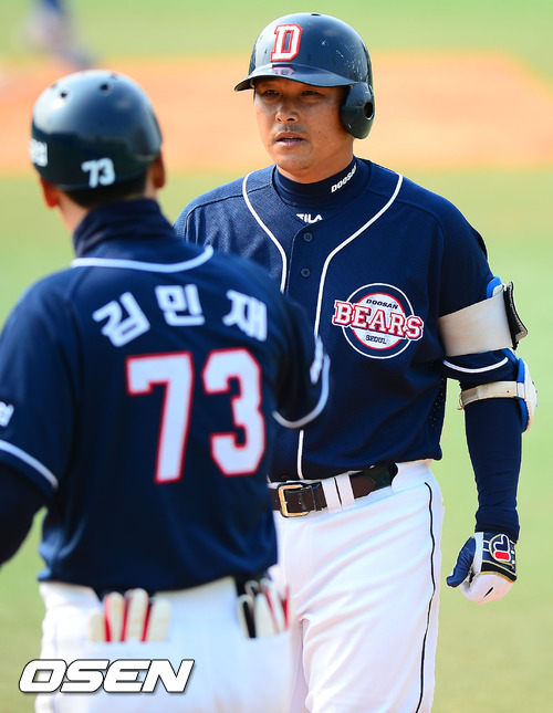 6회초 선두타자 두산 김동주가 중견수 앞 1루타를 날린 후 1루에서 김민재 코치와 하이파이브를 하고 있다.