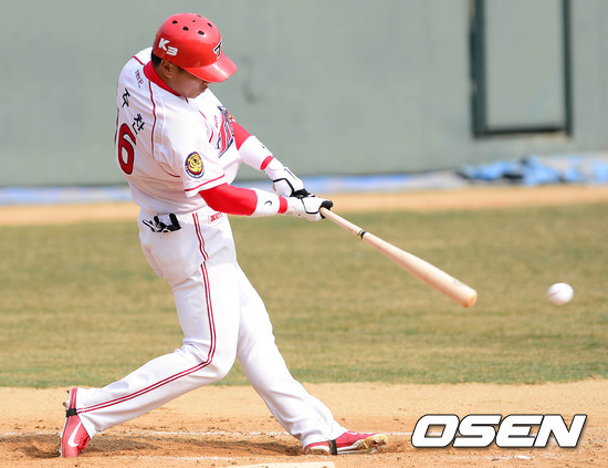12일 오후 광주구장에서 열린 '2013 한국야쿠르트 세븐 프로야구' KIA 타이거즈와 SK 와이번스의 시범경기 6회말 2사 만루 김주찬이 1타점 적시타를 치고 있다.