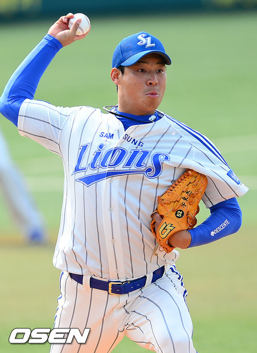 6회초 마운드에 오른 삼성 이동걸이 1루에 견재구를 던지고 있다.