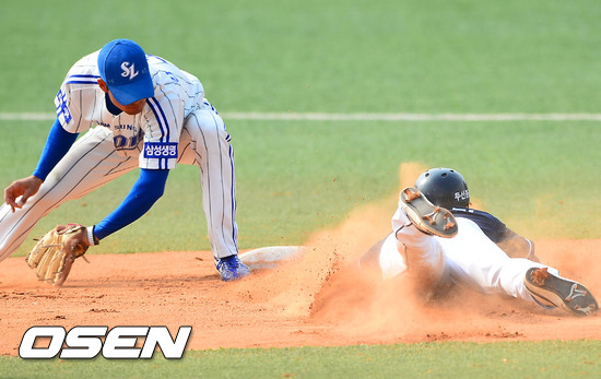 6회초 무사 주자 1루 두산 양의지 타석에서 1루 주자 허경민이 2루 도루에 성공하고 있다.