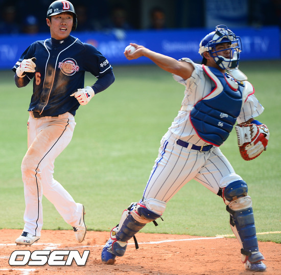6회초 무사 주자 만루 두산 정수빈의 1루수 앞 땅볼때 3루 주자 허경민이 홈에서 포스아웃 당하고 있다.