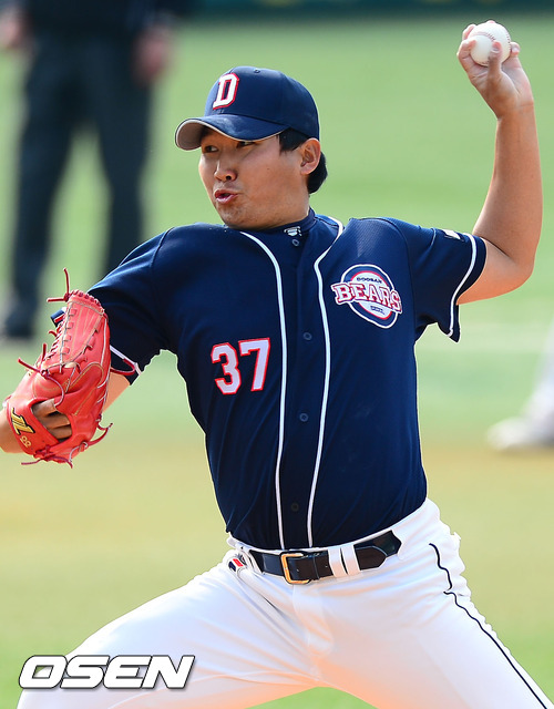 5회말에 두산 선발 서동환 대신 마운드에 오른 원용묵이 힘차게 공을 뿌리고 있다.