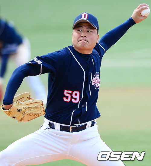 7회말 마운드에 오른 두산 이혜천이 힘차게 공을 뿌리고 있다.