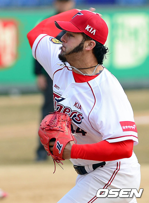 12일 오후 광주구장에서 열린 '2013 한국야쿠르트 세븐 프로야구' KIA 타이거즈와 SK 와이번스의 시범경기 9회초 무사 만루 마운드에 올라온 앤서니가 역투하고 있다.