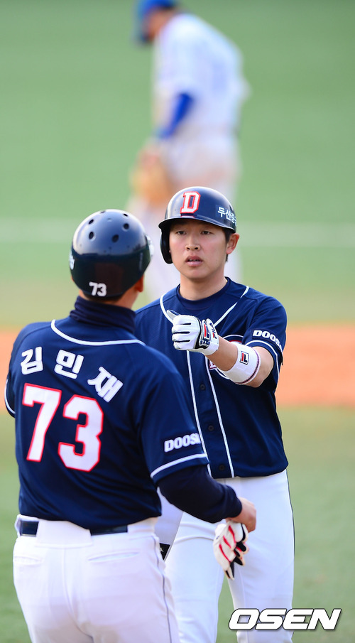 8회초 1사 주자 2루 두산 정수빈이 우익수 오른쪽 동점 1타점 적시타를 날린 후 2루에서 김민재 코치와 하이파이브를 하고 있다.