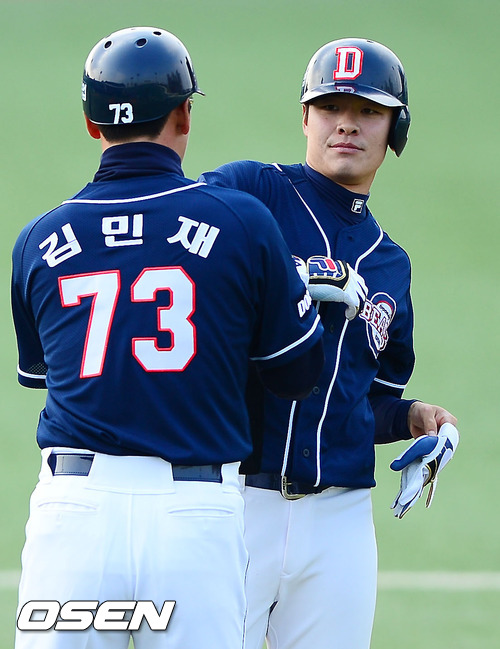 8회초 2사 주자 3루 두산 민병헌이 2루수 왼쪽 1타점 적시타를 날린 뒤 2루수 실책으로 2루에 세이프 된 후 김민재 코치와 하이파이브를 하고 있다.