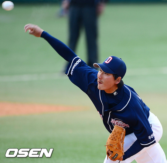 8회말 마운드에 오른 두산 정재훈이 힘차게 공을 뿌리고 있다.