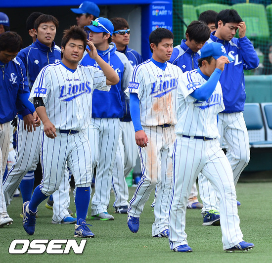 경기를 마치고 삼성 선수들이 아쉬운 표정을 지으며 그라운드로 나오고 있다. / rumi@osen.co.kr