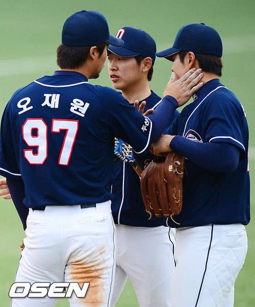 경기를 마치고 두산 오재훈이 결승타를 친 민병헌의 뺨을 장난으로 치고 있다. / rumi@osen.co.kr