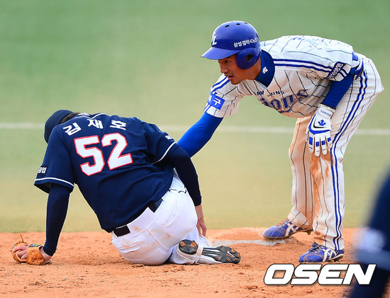 9회말 2사 주자 없는 상황에서 삼성 김상수가 우익수 오른쪽 2루타를 날린 후 2루에 몸을 날릴때 실수로 두산 김재호의 발을 스파이크로 차 김재호가 고통스러워 하고 있다. / rumi@osen.co.kr