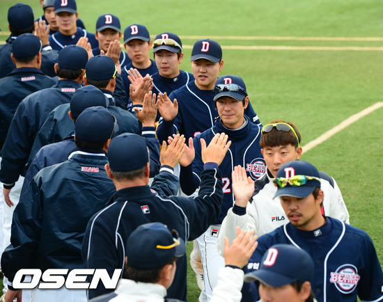 경기를 마치고 두산 선수들이 코치들과 하이파이브를 하고 있다. / rumi@osen.co.kr