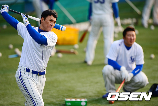 경기를 마치고 삼성 이승엽이 타격훈련을 하고 있고 이 모습을 최형우가 지켜보고 있다. / rumi@osen.co.kr