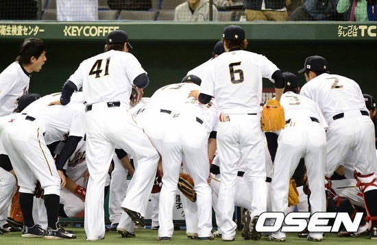 12일 오후 일본 도쿄돔에서 열린 '2013 월드베이스볼클래식(WBC)' 2라운드 1조 일본과 네덜란드의 경기, 경기에 앞서 일본 선수들이 덕아웃에서 파이팅을 외치고 있다.