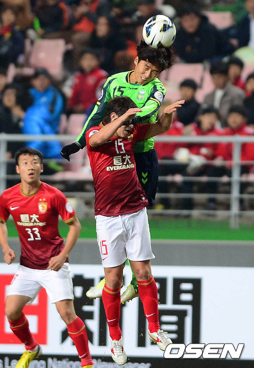 12일 오후 전주 월드컵경기장에서 열린 2013 아시아축구연맹(AFC) 조별리그 2차전 전북 현대와 광저우 에버그란데의 경기 전반 정혁이 공중볼 다툼을 하고 있다.