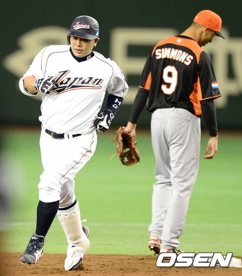 12일 오후 일본 도쿄돔에서 열린 '2013 월드베이스볼클래식(WBC)' 2라운드 1조 일본과 네덜란드의 경기, 2회말 2사 1,3루에서 일본 아베가 스리런 홈런을 날리고 그라운드를 돌고 있다.