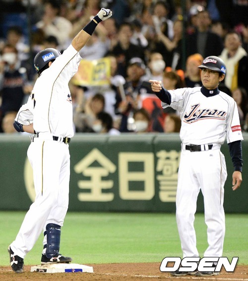 12일 오후 일본 도쿄돔에서 열린 '2013 월드베이스볼클래식(WBC)' 2라운드 1조 일본과 네덜란드의 경기, 2회말 1사 만루에서 일본 마쓰다가 역전 적시타를 치고 환호하고 있다.