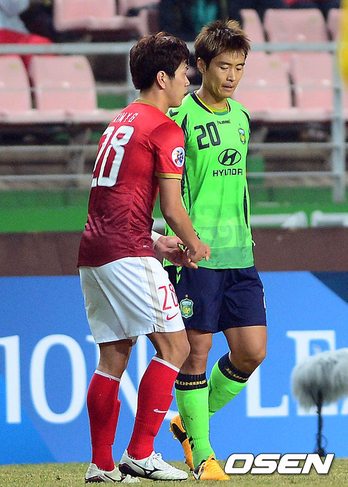 12일 오후 전주 월드컵경기장에서 열린 2013 아시아축구연맹(AFC) 조별리그 2차전 전북 현대와 광저우 에버그란데의 경기 종료 후 김영권과 이동국이 인사를 나누고 있다.