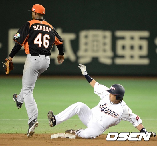 12일 오후 일본 도쿄돔에서 열린 '2013 월드베이스볼클래식(WBC)' 2라운드 1조 일본과 네덜란드의 경기, 6회말 1사에서 일본 마쓰다가 중전 2루타를 치고 슬라이딩을 하고 있다.