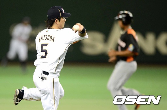 12일 오후 일본 도쿄돔에서 열린 '2013 월드베이스볼클래식(WBC)' 2라운드 1조 일본과 네덜란드의 경기, 7회초 2사 1루에서 네덜란드 두얼스마의 타구를 잡은 일본 마쓰다가 1루로 빠른 송구를 하고 있다.