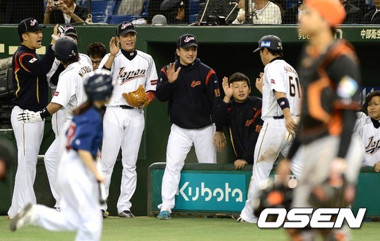 12일 오후 일본 도쿄돔에서 열린 '2013 월드베이스볼클래식(WBC)' 2라운드 1조 일본과 네덜란드의 경기, 8회말 2사 2,3루에서 일본 조노의 적시타 때 홈을 밟은 주자들이 덕아웃에서 동료들과 환호하고 있다.