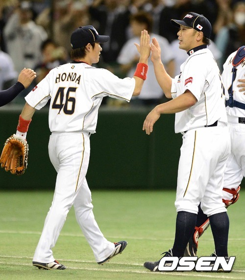 경기 종료 후 일본 아베가 동료들과 승리의 기쁨을 나누고 있다./sunday@osen.co.kr