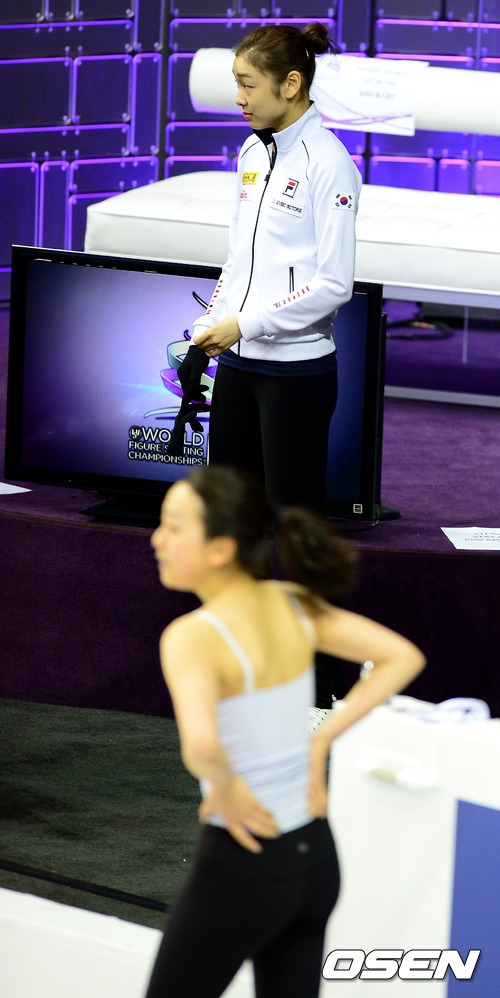 김연아가 13일(한국시각) 2013 국제빙상경기연맹(ISU) 세계피겨선수권대회가 열리는 캐나다 몬타리오주 런던 버드와이저 가든스에서 공식훈련 순서를 기다리고 있다. 앞서 아사다 마오가 훈련을 하고 있다.