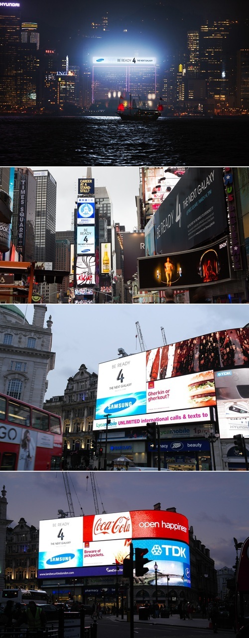 삼성전자는 지난 4일 미국 뉴욕 타임스퀘어를 시작으로 영국 피카딜리 서커스, 홍콩섬 하코트앤파이오니어 빌딩에 'BE READY 4 THE NEXT GALAXY' 라는 대형 광고판을 설치해 하나둘 불을 밝혔다.