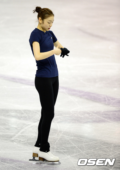 김연아가 13일(한국시각) 2013 국제빙상경기연맹(ISU) 세계피겨선수권대회가 열리는 캐나다 몬타리오주 런던 버드와이저 가든스에서 공식훈련 도중 손가락을 만지고 있다.