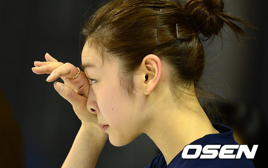 김연아가 13일(한국시각) 2013 국제빙상경기연맹(ISU) 세계피겨선수권대회가 열리는 캐나다 몬타리오주 런던 버드와이저 가든스에서 공식훈련 도중 땀을 닦고 있다.