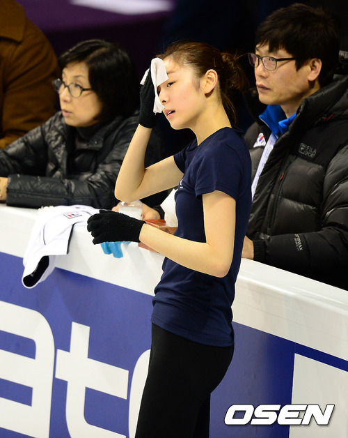 김연아가 13일(한국시각) 2013 국제빙상경기연맹(ISU) 세계피겨선수권대회가 열리는 캐나다 몬타리오주 런던 버드와이저 가든스에서 공식훈련 도중 땀을 닦고 있다.