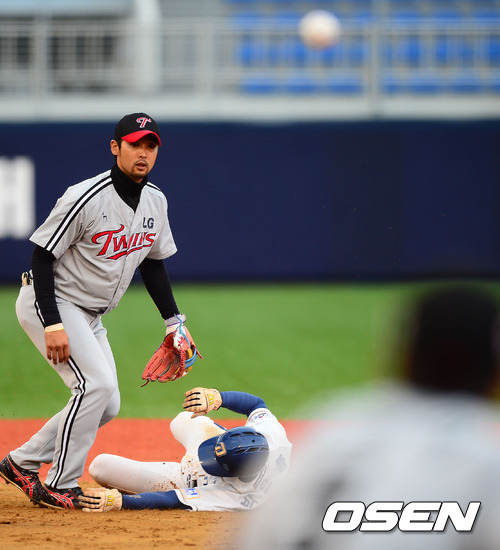 4회말 1사 주자 1루 NC 이호준의 유격수 병살타 때 LG 2루수 서동욱이 2루에서 NC 박으뜸을 포스아웃 시킨 후 1루로 송구하고 있다.