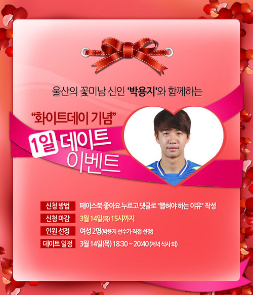 이번 행사는 울산의 신인 박용지 선수와 함께 진행된다. 선정된 여성 팬 2명은 박용지와 함께 1일 데이트를 하게 된다. 저녁식사를 함께 하게 되며 직접 제작한 케이크 및 기념품이 전달된다.