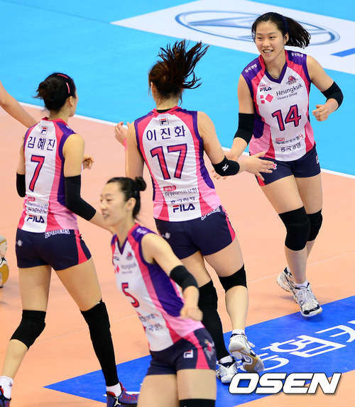 13일 오후 대전 충무체육관에서 열린 '2012-2013 NH농협 V-리그' 여자부 인삼공사와 흥국생명의 경기 1세트 흥국생명 선수들이 득점 후 기뻐하고 있다.