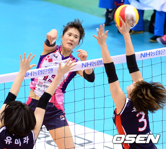 13일 오후 대전 충무체육관에서 열린 '2012-2013 NH농협 V-리그' 여자부 인삼공사와 흥국생명의 경기 3세트 박성희의 공격이 브로킹에 걸리고 있다.