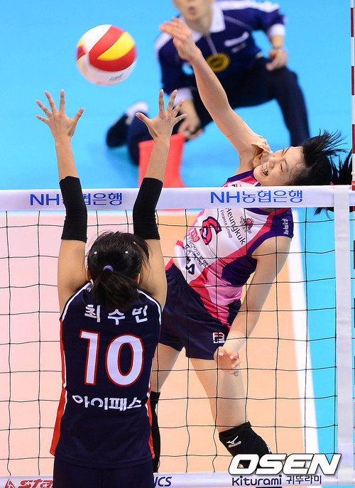 13일 오후 대전 충무체육관에서 열린 '2012-2013 NH농협 V-리그' 여자부 인삼공사와 흥국생명의 경기 3세트 주예나가 공격을 시도하고 있다.