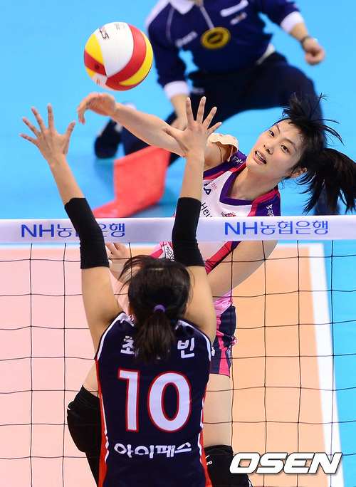 13일 오후 대전 충무체육관에서 열린 '2012-2013 NH농협 V-리그' 여자부 인삼공사와 흥국생명의 경기 3세트 주예나가 공격을 시도하고 있다.