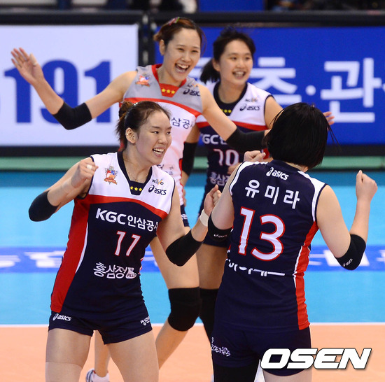 인삼공사는 13일 대전 충무체육관에서 열린 ‘2012-2013 NH농협 V-리그’ 여자부 흥국생명과의 시즌 최종전에서 국내 선수들의 고른 활약에 힘입어 3-2(25-16 18-25 18-25 25-16 15-12)로 역전승했다. 이 경기 결과와 관계없이 최하위가 확정되어 있었던 인삼공사는 올 시즌을 5승25패(승점 15점)로 마무리했다. 역시 5위가 확정됐던 흥국생명은 6승24패(승점 22점)을 기록했다. / baik@osen.co.kr