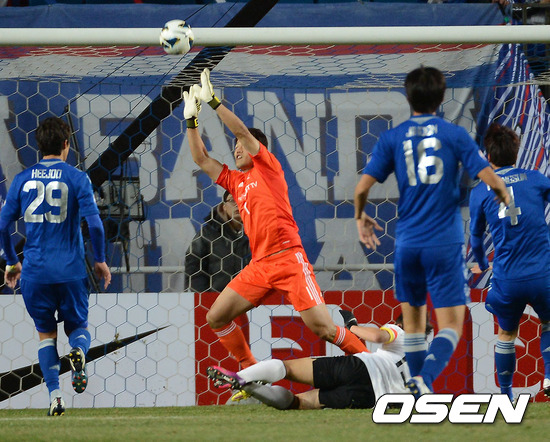 13일 오후 경기 수원월드컵경기장에서 열린 AFC 챔피언스리그(ACL) 조별 예선 H조 수원 삼성과 귀저우 런허(중국)의 경기, 전반 수원 정성룡이 선방하고 있다