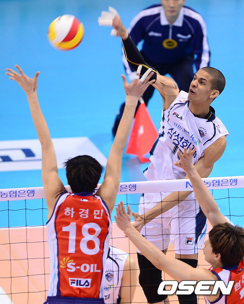 13일 오후 대전 충무체육관에서 열린 '2012-2013 NH농협 V-리그' 남자부 삼성화재와 대한항공의 경기 1세트 레오가 공격을 시도하고 있다.