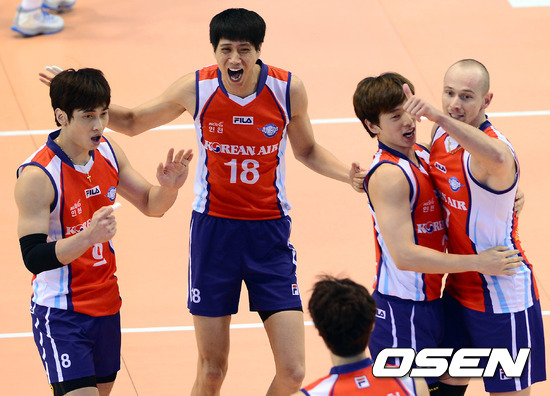 13일 오후 대전 충무체육관에서 열린 '2012-2013 NH농협 V-리그' 남자부 삼성화재와 대한항공의 경기 1세트 대한항공 선수들이 득점 후 기뻐하고 있다.